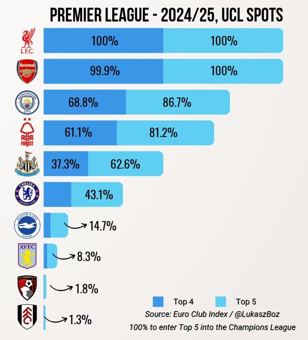 2025-04-01 00:00:19英超球队前4/前5概率:红军枪手稳坐钓鱼台 切尔西43.1%进前五
