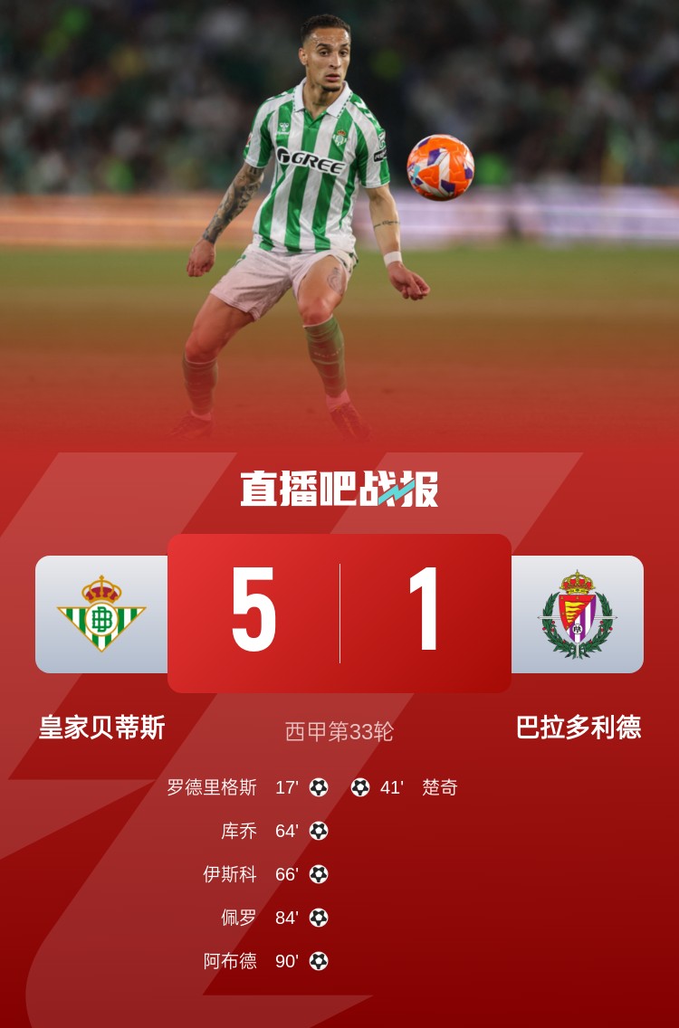 贝蒂斯5-1大胜巴拉多利德,先赛跻身欧冠区,同时送巴拉多利德提前5轮降级。