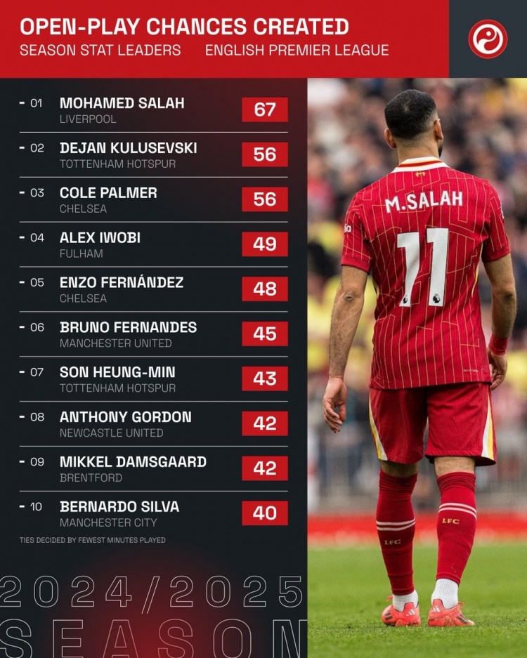 2025-03-19 04:00:14本赛季英超运动战创造机会榜:萨拉赫居首,帕尔默、B费、B席在列