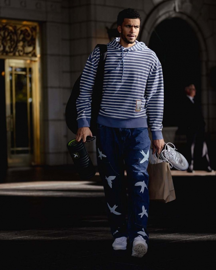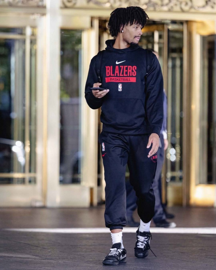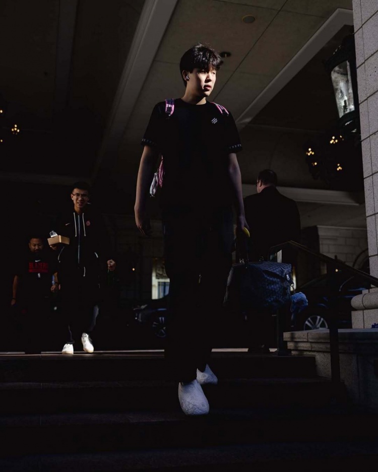 杨瀚森背着粉色小书包 利拉德&阿夫迪亚黑框眼镜 开拓者今日OOTD
